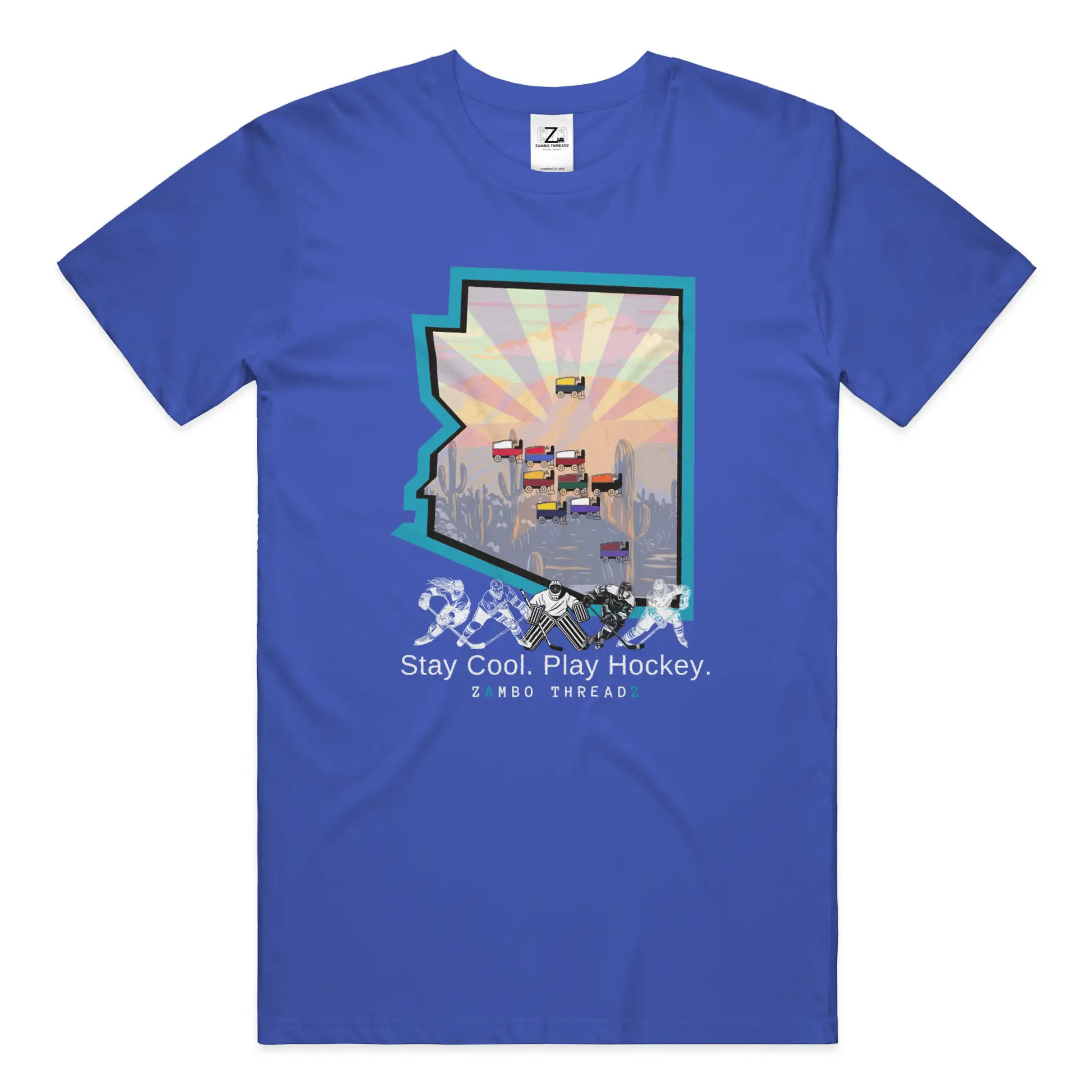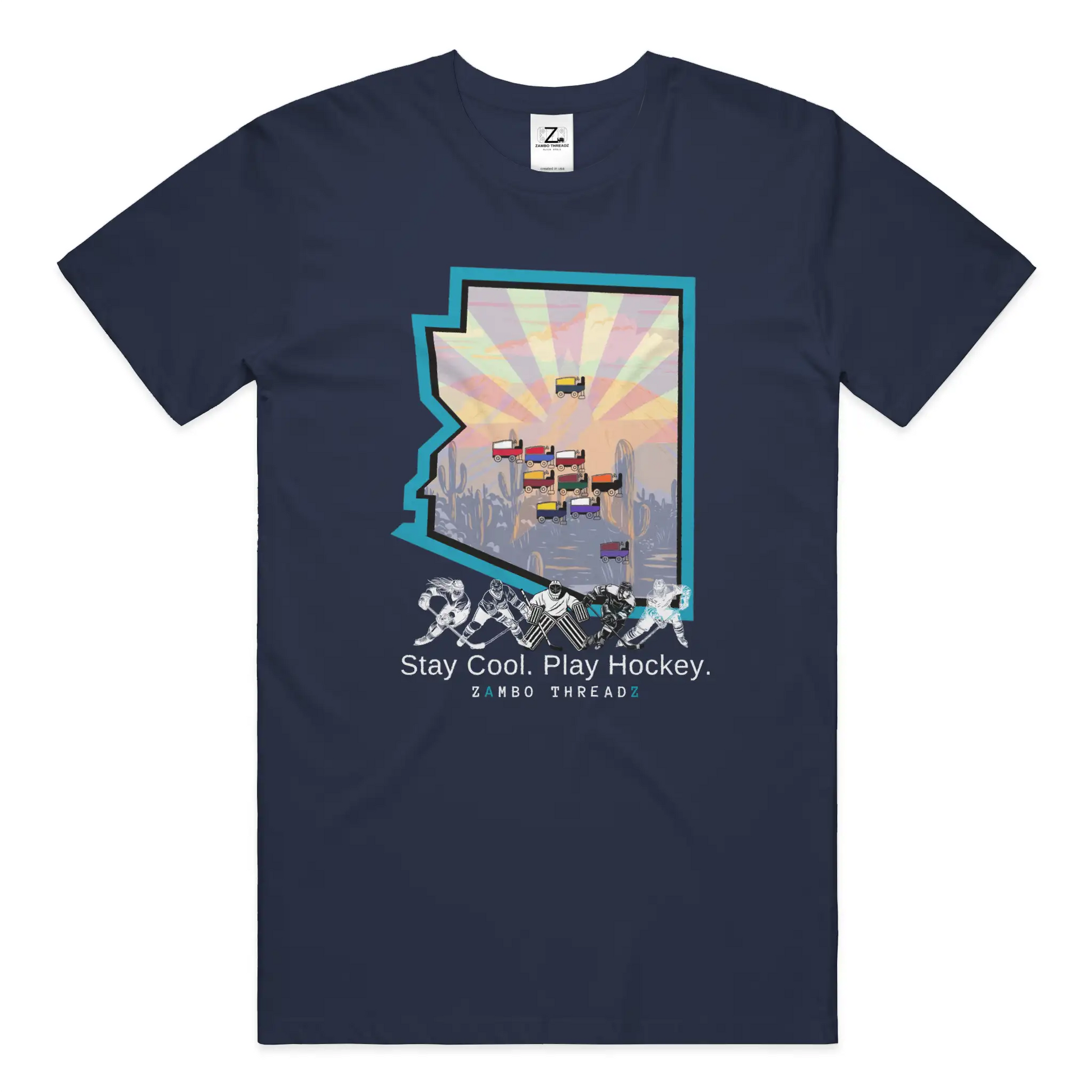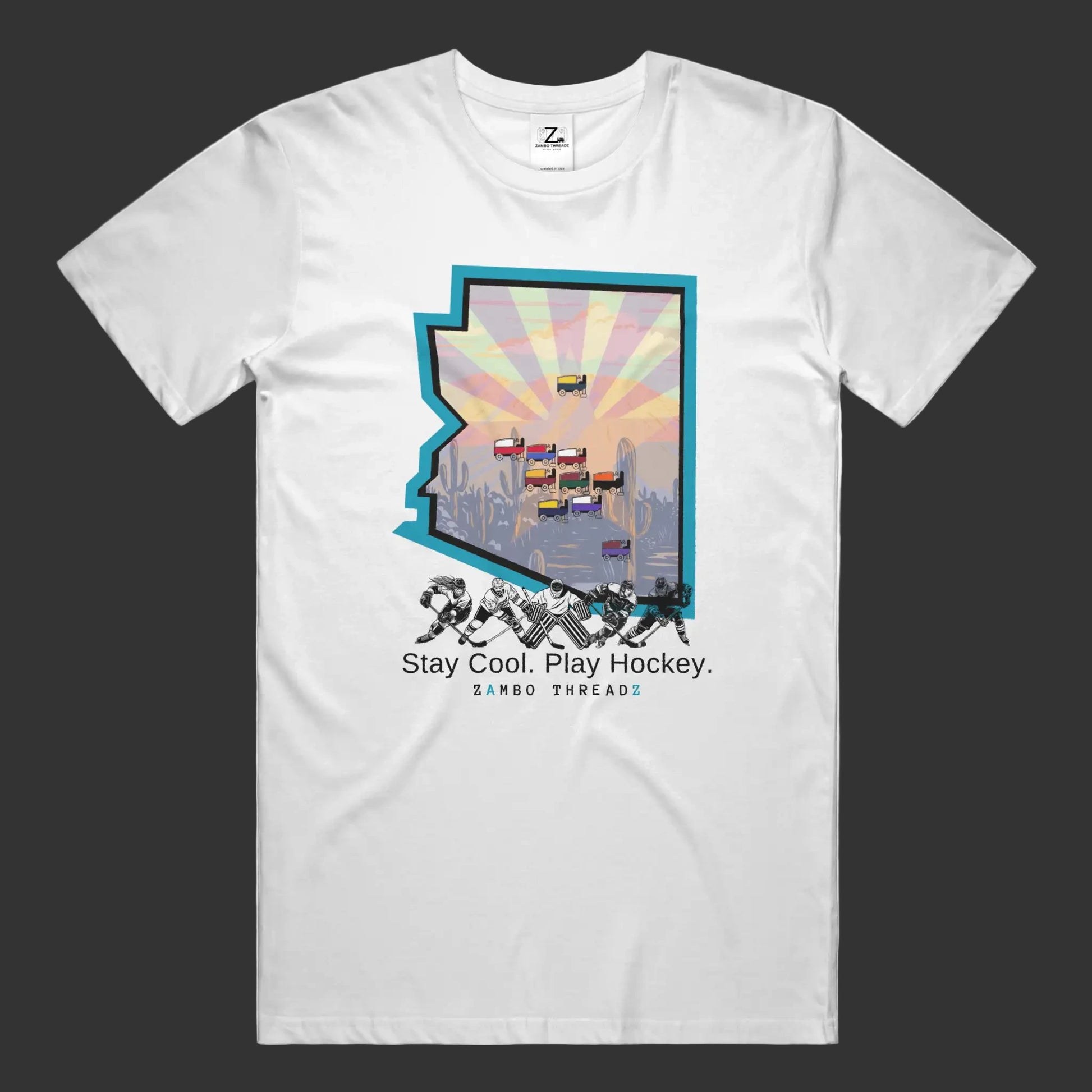 Support Arizona hockey! It might be a desert state but Arizona has nine ice complexes to keep you cool which are highlighted on the shirt! The t-shirt is soft and lightweight, with the right amount of stretch. It's comfortable and flattering for all. A must for all Arizona hockey players and fans!